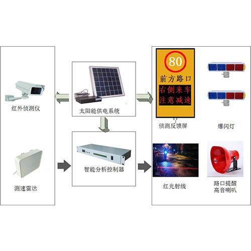 雷达检测预警系统采用雷达及输出设备对道路交通进行即时动态的侦测、警告、引导和管制,实现道路交通安全有序、保障驾驶人生命和财产安全的目标。以警示和预防为目的,及时提醒驾驶员注意降低速度,从而有效减少因超速或盲区会车时引发道路交通事故的发生。
